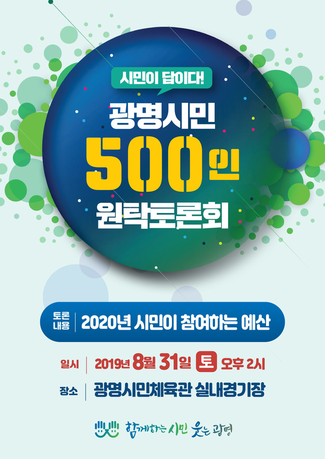 [광명=로컬라이프] 송준형 기자 = 광명시는 오는 31일 오후 2시 시민체육관에서 ‘광명시민 500인 원탁토론회’를 개최한다고 밝혔다.