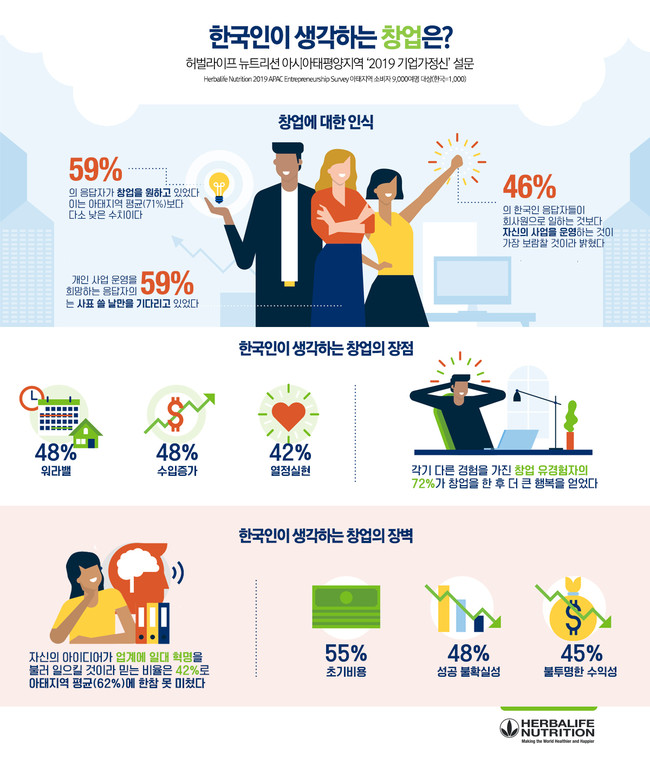 글로벌 뉴트리션 전문기업 한국허벌라이프가 아시아태평양지역(이하 아태지역) 소비자 대상으로 진행한 ‘기업가정신(entrepreneurship)’ 설문조사 결과, 한국인은 아태지역 평균에 비해 창업 의지가 낮으며 초기 비용과 불투명한 수익성, 아이디어 부족 등의 이유로 창업에 보수적인 것으로 나타났다.