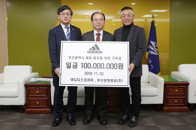 아디다스가 전달한 기부금은 부산시 체육발전을 위해 부산시 체육회 및 부산시 장애인 체육회에 사용될 예정이다.