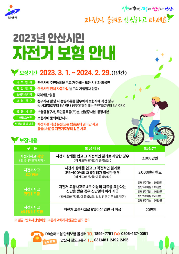 안산시(시장 이민근)는 시민들이 자전거를 안전하게 이용할 수 있도록 전 시민을 대상으로 자전거 보험에 가입했다고 9일 밝혔다.