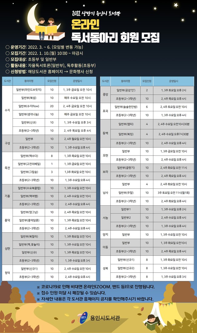 용인시가 오는 10일부터 관내 공공도서관 17곳의 온라인 독서동아리에서 활동할 회원 426명을 선착순 모집한다고 6일 밝혔다.