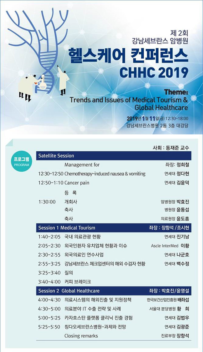 1월 11일 강남세브란스병원 3층 대강당에서 열리는 이번 콘퍼런스는 ‘Trends and Issues of Medical Tourism & Global Healthcare’를 주제로 국내 의료 관광 현황과 외국의료인 연수 사업, 해외 수검자 현황, 디지털 헬스케어, 의료분야 IT 수출 전략, 강남세브란스병원의 카자흐스탄 플랫폼 클리닉 진출 경험 등을 주요 이슈로 다룬다.