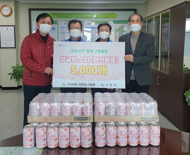 무궁화를 알리는 시민단체인 ‘무궁화를 사랑하는 사람들’이 “코로나19 방역을 담당하는 공직자들에게 전달해 달라”며 수원시에 탄산음료 5000개를 기부했다.