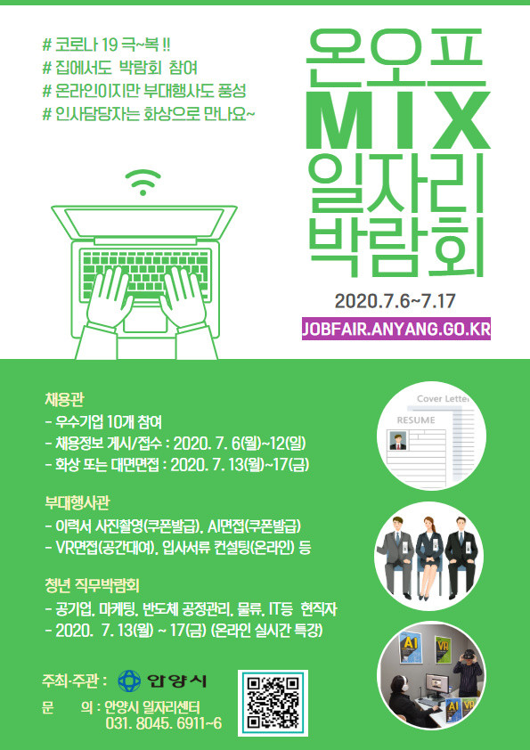이번‘온오프믹스 일자리박람회’는 온라인 중심으로 박람회 전용 홈페이지(jobfair.anyang.go.kr)를 개설해 채용관, 부대행사관, 청년직무박람회까지 기존의 현장박람회만큼 풍성하게 운영된다.