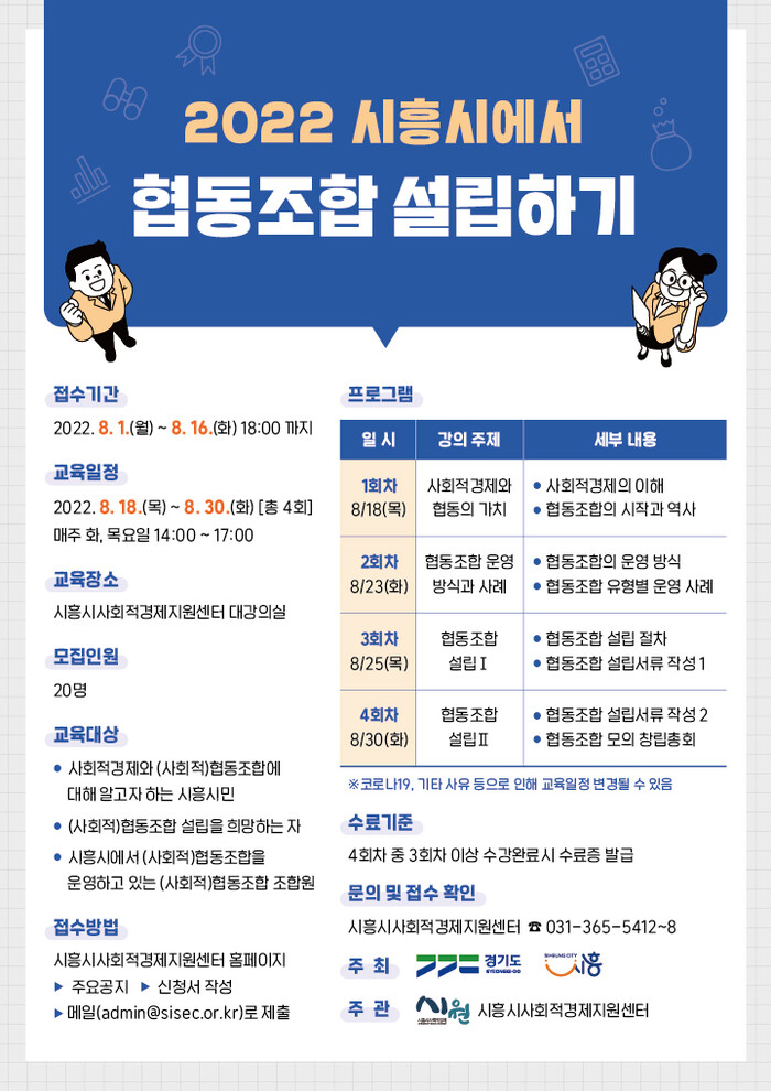 시흥시(시장 임병택)는 시민의 자발적 참여를 통해 공동체를 강화하고, 경제적 자립을 만들어가는 사회적경제조직인 ‘협동조합’에 대한 시민들의 이해를 높이고, 설립을 돕고자 ‘2022 시흥시에서 협동조합 설립하기’ 교육과정을 오는 8월 18일부터 8월 30일까지 운영한다.