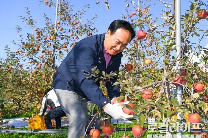 | ▲ 이권재 오산시장이 ‘오산시-장수군 자매결연체결 기념 오산시민 사과따기 체험’ 행사에 참석하고 있다. (사진출처=이권재 페이스북) |