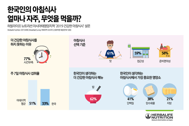 글로벌 뉴트리션 전문기업 한국허벌라이프가 아시아태평양지역(이하 아태지역) 소비자 대상으로 진행한 ‘건강한 아침식사’ 설문조사 결과, 한국인의 아침식사 섭취율이 현저히 낮고 메뉴 선택 시에도 균형 잡힌 영양에 대한 고려가 부족한 것으로 드러났다.