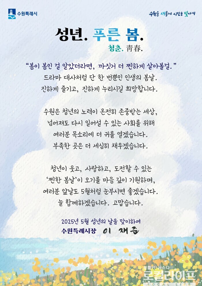 [수원=로컬라이프] 송준형 기자 = 이재준 수원특례시장이 성년의 날을 맞아 축하를 전했다.