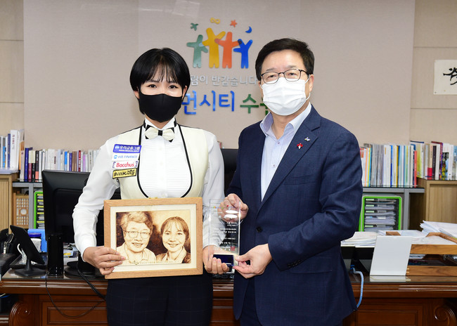 사진/염태영 시장과 스롱 피아비씨가 위촉식 후 기념촬영을 하고 있다<수원시청 제공>