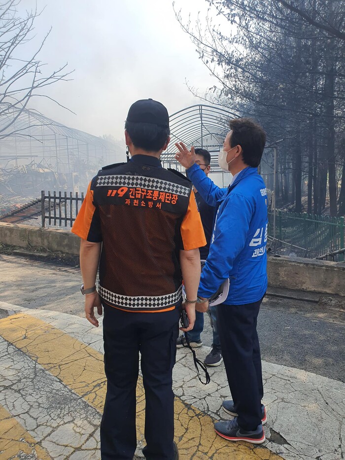 [로컬라이프] 송준형 기자 = 김종천 과천시장 후보(더불어민주당)는 주암동 화훼단지에서 화재가 발생했다는 소식에 한걸음에 달려갔다며, 인명 피해가 없어서 다행이라고 말했다.
