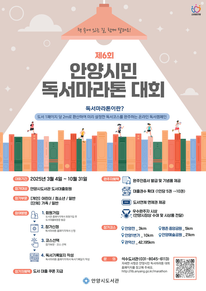 이번 대회 참가 신청은 안양시도서관 독서마라톤 홈페이지에서 3월 4일부터 가능하며, 안양시도서관 도서 대출 회원이면 누구나 참여할 수 있다.