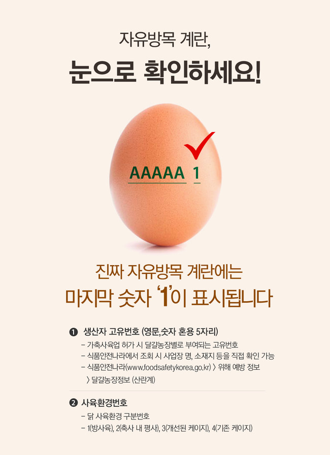 지금까지는 일반 동물복지 인증 계란과 동물복지 ‘자유방목’ 인증 계란의 구별이 어려웠으나, 올 4월 말부터 사육환경표시제도가 시행됨에 따라 계란 껍질 위 숫자만으로도 쉽게 자유방목 계란을 확인할 수 있게 되었다. 계란 껍질 위 맨 마지막 숫자가 바로 사육환경 표시인데, 이 마지막 숫자가 ‘1’인 계란만이 자유롭게 방사(방목)해 키운 닭에서 얻은 계란이다.