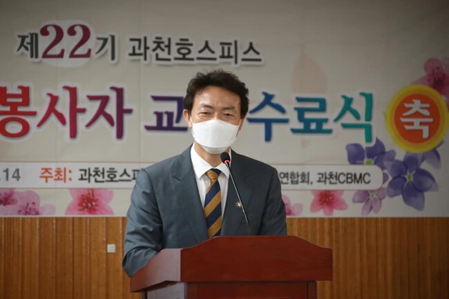[로컬라이프] 김종천 과청시장은 15일, 코로나19로 힘들고 어려운 시기에도 보이지 않는 곳에서 묵묵히 나눔과 사랑을 실천하는 ‘과천호스피스회 제22기 자원봉사자 교육 수료생’분들의 노고에 깊은 존경과 감사의 말씀을 드린다고 말했다.
