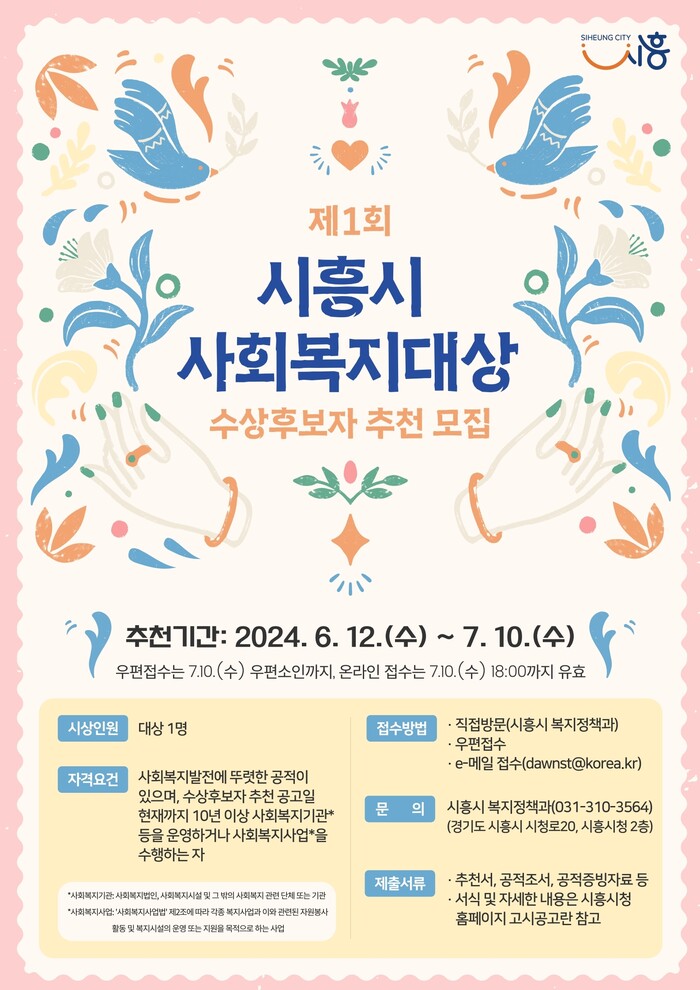 시흥시(시장 임병택)가 ‘제1회 시흥시 사회복지대상’ 수상 후보자를 모집한다고 24일 밝혔다.