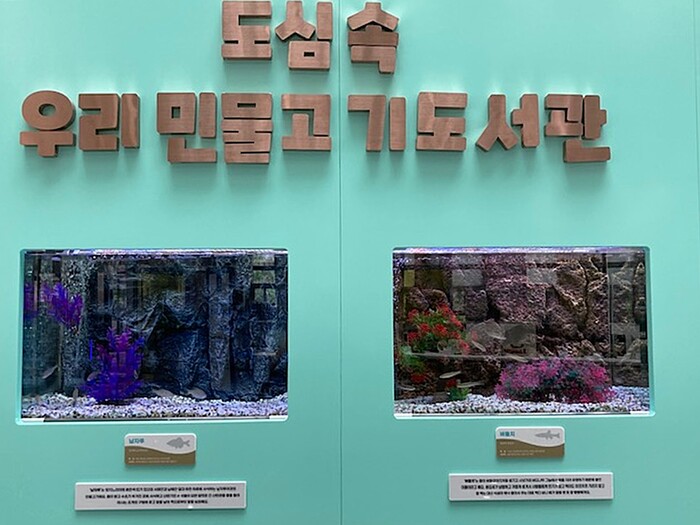사진/ 광교홍재도서관 1층 로비에 전시된 토종 민물고기 수조(사진제공=수원시)