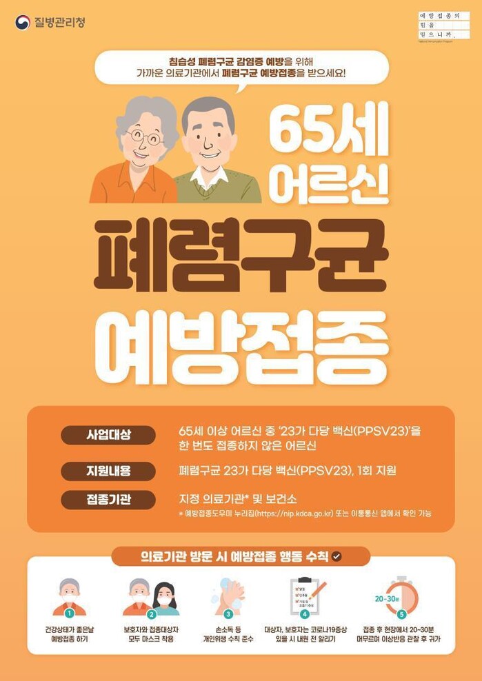 접종 대상은 만 65세 이상 어르신 중 폐렴구균 백신을 한 번도 접종하지 않은 어르신이며, 지원 백신은 23가 다당백신(PPSV23)으로 1회 접종 지원받을 수 있다.