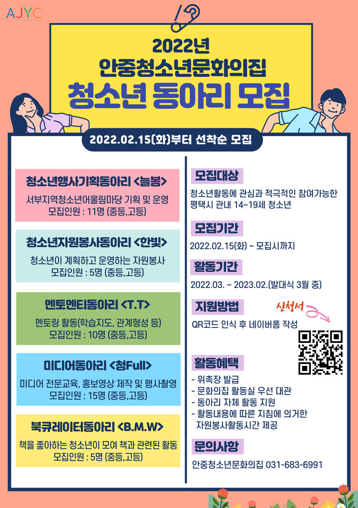 청소년 동아리 모집과 관련한 문의는 안중청소년문화의집(031-683-6991)으로 연락하면 안내받을 수 있다.