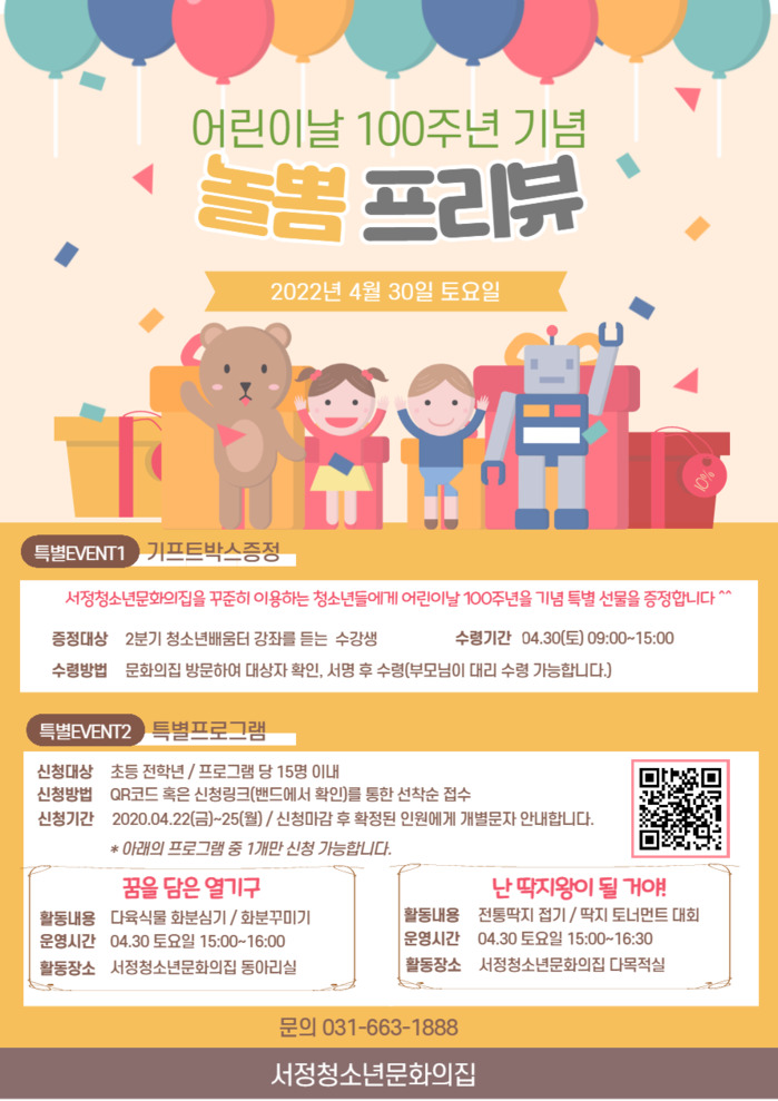 평택시에서 위탁받아 (사)평택YFC에서 운영하는 서정청소년문화의집은 2022년 어린이날 100주년을 기념하기 위해 오는 30일(토)에 특별프로그램과 정기형 강좌 이용 청소년대상 이벤트를 진행한다.