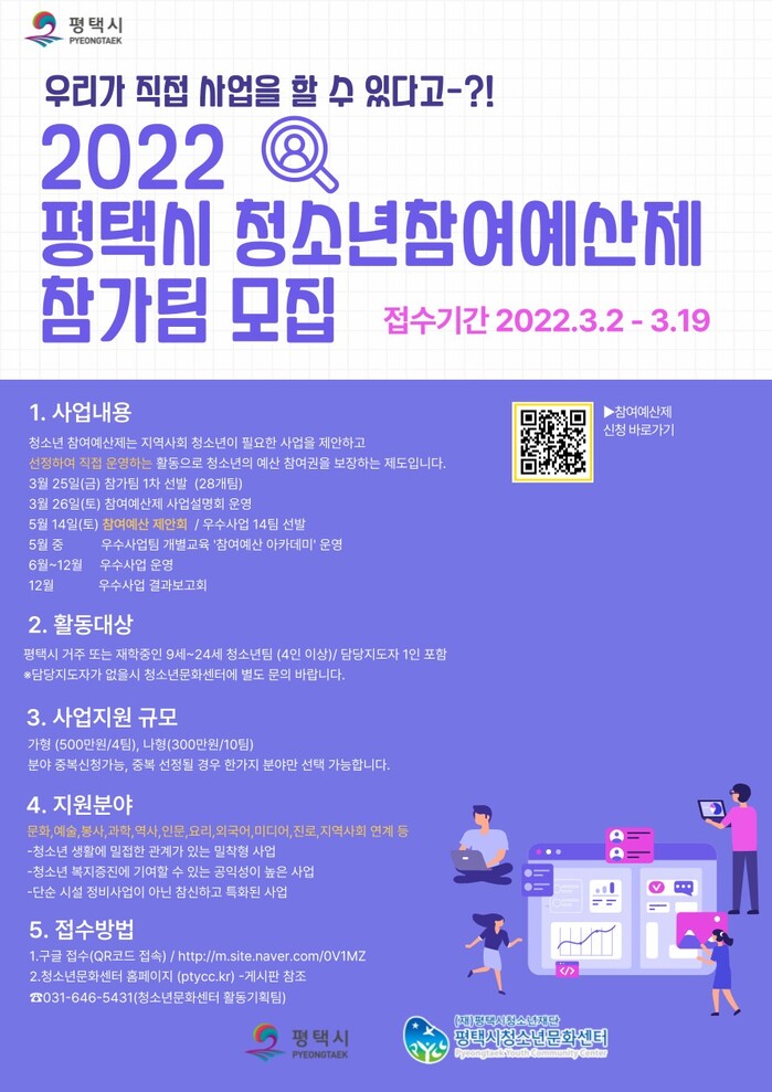 평택시(시장 정장선) 위탁기관인 평택시청소년문화센터는 2022년 청소년참여예산제 참가팀을 모집한다.