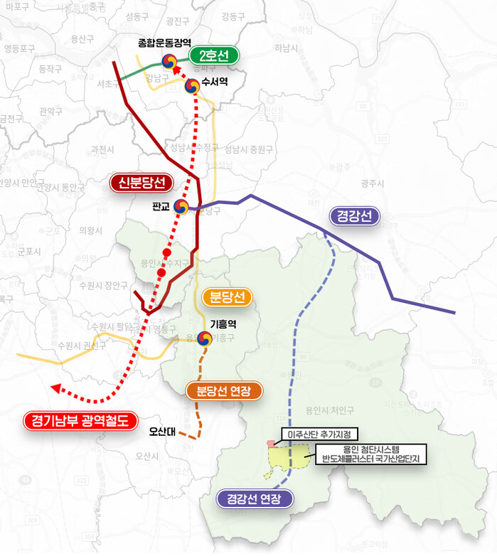 이 시장은 이날 용인특례시 기흥구 농서동 삼성전자 기흥캠퍼스에서 진행된 ‘용인 첨단시스템반도체 클러스터 국가산업단지 승인 기념행사’에서 박 장관을 만나 ▲경강선 연장 사업(경기 광주역~용인 이동‧남사, 37.97km, 총사업비 2조 3154억원 추정) ▲경기남부광역철도 신설 사업(서울 종합운동장역~수서역~성남 판교~용인 신봉‧성복동~수원 광교~화성 봉담, 50.7km, 총사업비 5조 2000억원 추정)이 내년도에 수립될 국토교통부의 제5차 국가철도망구축계획에 꼭 반영될 수 있도록 지원해 달라며 관련 자료와 서한을 전달했다.