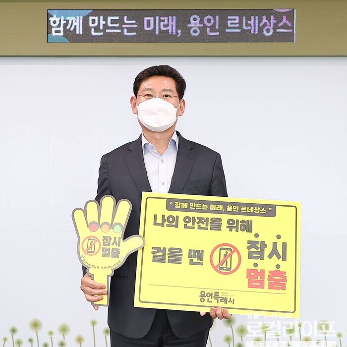 이와 관련해 이상일 용인시장은 21일, 자신의 페이스북에 “나의 안전을 위해 보행 중 스마트폰 잠시멈춤!”이라는 제목의 글을 올려 “이제 휴대폰이 없는 세상은 상상할 수 없다. 우리는 수시로 폰을 터치하며 바라본다”며 “길을 건널 때도 시선을 스마트폰에 고정하는 이들도 많이 있다”고 지적했다.