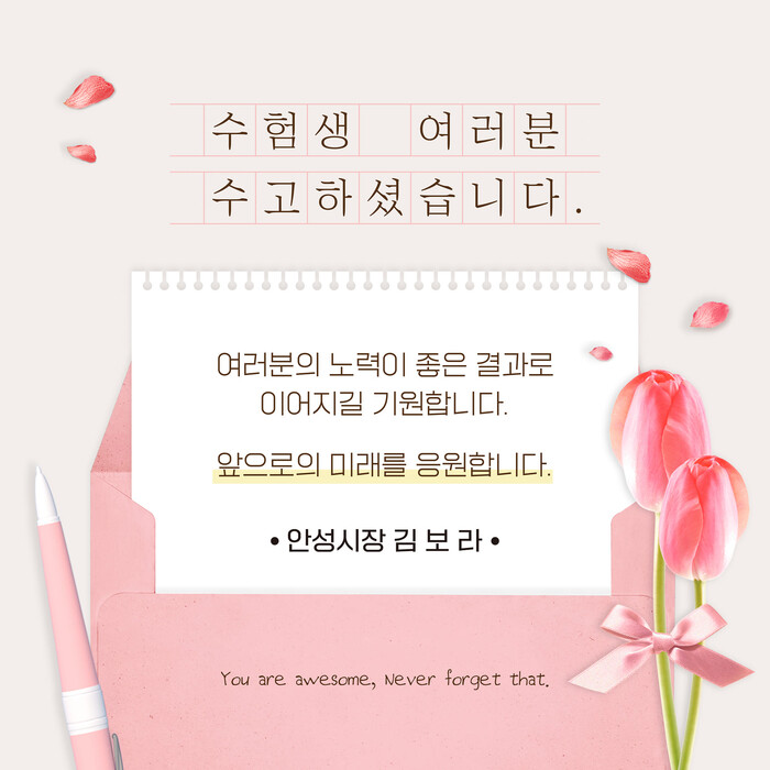 [로컬라이프] 송준형 기자 = 김보라 안성시장은 17일, 수험생 여러분 수고하셨다고 전했다.