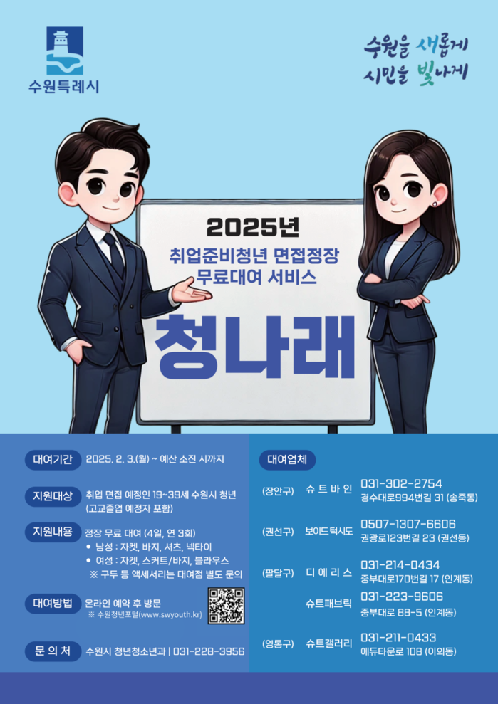 수원시(시장 이재준)가 취업준비청년에게 면접 정장을 무료로 빌려주는 ‘2025년 청나래’ 사업을 2월 3일 시작한다.