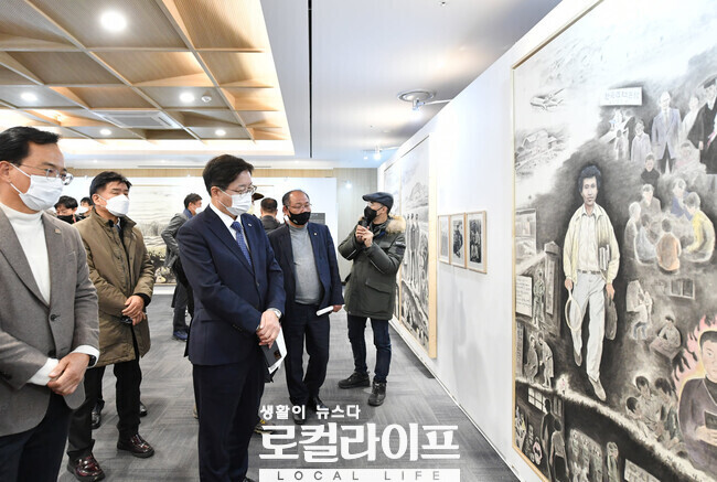 [수원=로컬라이프] 송준형 기자 = 수원컨벤션센터에서 5.18 광주민주항쟁 당시 시민군 대변인으로서 전남도청을 사수하다 신군부의 총탄에 30살 꽃다운 나이에 목숨을 잃고 5.18의 상징이 된 윤상원 열사의 일대기를 담은 "글과 수묵, 사진으로 만나는 '임을 위한 행진곡'. 윤상원" 전시회가 수원컨벤션센터에서 121일부터 14일까지 개최된다.