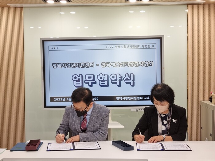 평택시청년지원센터(센터장 김승현)와 한국예술심리상담사협회(회장 이근매)는 지난 19일 평택시청년지원센터에서 업무협약(MOU)을 체결했다.