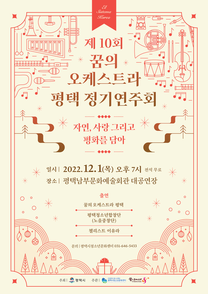 (재)평택시청소년재단 평택시청소년문화센터(센터장 곽지숙)는 오는 12월 1일(목) 오후 7시 평택시남부문화예술회관 대공연장에서 ‘제10회 꿈의 오케스트라 평택’ 정기연주회를 개최한다.