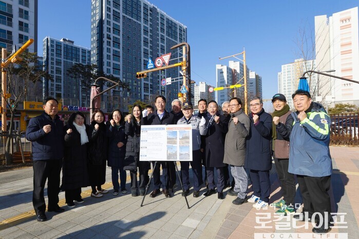[화성=로컬라이프] 송준형 기자 = 정명근 화성특례시장은 24일, 화성서부경찰서와 함께 송린초등학교 앞 'LED 차량신호등 보조장치'를 점검했다.