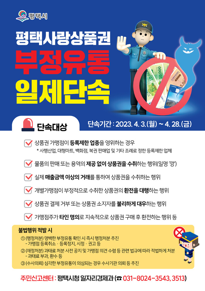 시 관계자는 “평택사랑상품권이 많은 사람의 관심을 받는 만큼 부정 유통 단속을 철저히 하여 건전한 유통 질서 확립에 최선을 다하겠다”며 “가맹점주와 시민 여러분들의 적극적인 협조를 부탁드린다”고 말했다.