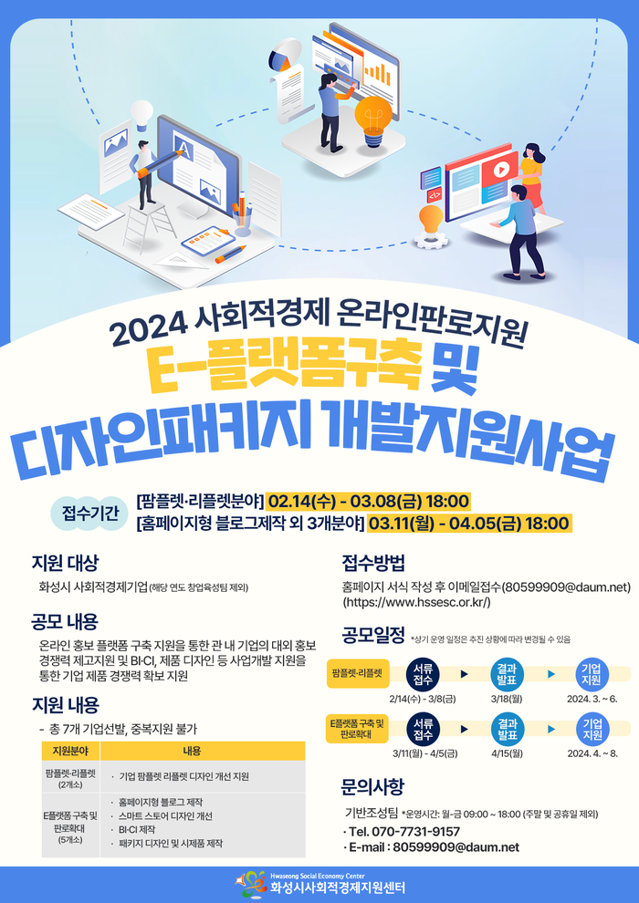자세한 내용은 화성시사회적경제지원센터 홈페이지에서 확인하거나 화성시사회적경제지원센터(☏070-7731-9157)로 문의하면 된다.