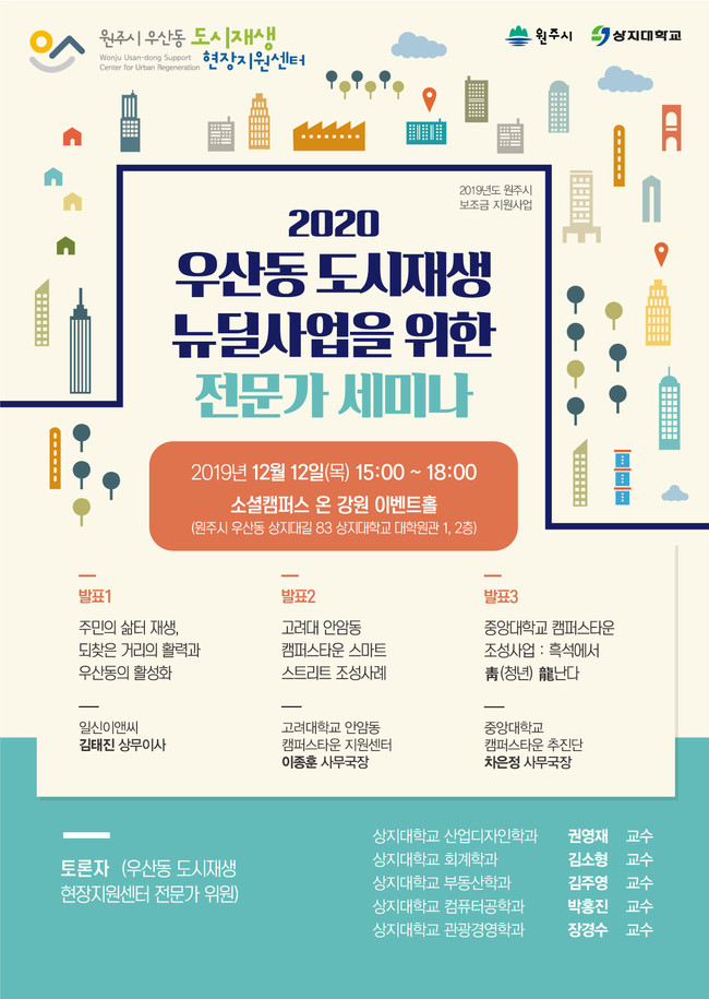[원주=로컬라이프] 송준형 기자 = 원주시 우산동 도시재생현장지원센터(센터장 김상호)는 12월 12일(목) 오후 3시 상지대학교 대학원관 2층 소셜캠퍼스 온 강원 이벤트홀에서 우산동 도시재생 뉴딜사업을 위한 전문가 세미나를 개최한다.