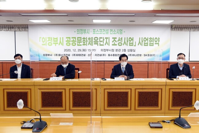 [로컬라이프] 의정부시(시장 안병용)가 용현동 306보충대 부지 일원 개발제한구역에 의정부시 공공문화체육단지 조성사업을 본격 추진한다. 이 사업은 지난 8월 공모를 통해 우선협상대상자로 선정된 포스코건설 컨소시엄[㈜포스코건설, ㈜태영건설, 신진유지건설(주), 토수종합건설(주), ㈜하나은행, SK증권(주)]과 12월 29일 성공적인 사업시행을 다짐하고 지역의 균형발전 및 주민의 복리증진 도모를 위해 사업협약을 체결했다.