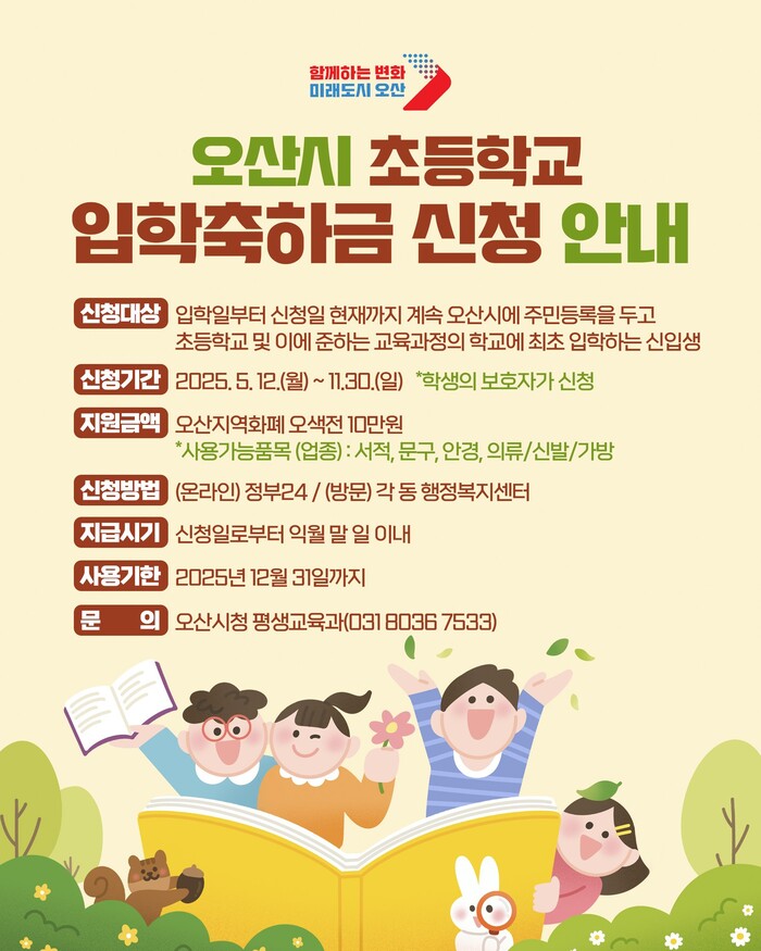이권재 시장은 “오산시는 2025년 초등학교에 입학한 신입생들에게 1인 10만 원을 지역화폐 오색전으로 보편 지원한다. 아이들의 새로운 시작을 축하하는 마음을 담았다”며 “정부24(www.gov.kr)에서 '오산시 초등학교 입학축하금 지원' 검색 후 신청하시거나 거주지 동 행정복지센터에 방문해 신청하시면 된다”고 알렸다.