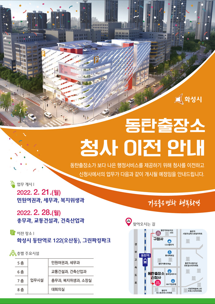 화성시 동탄출장소가 보다 나은 행정서비스 제공을 위해 동탄역로 122(오산동)에 위치한 그린파킹파크로 이전하고 오는 21일부터 신청사 업무를 개시한다.