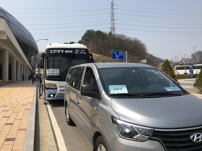 이에 시는 용인시 거점 정류장인 시민체육공원에 하차한 입국자를 특별수송 차량에 태워 각 보건소 선별진료소에서 검체를 채취한 후 자택을 비롯한 자가격리 장소까지 수송하고 있다.