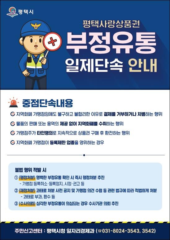 이번 부정 유통 단속의 중점 대상은 △평택사랑상품권을 부정한 방법으로 수취하고 환전하는 행위(속칭 ‘깡’) △등록 제한 업종이 상품권을 취급하는 행위 △평택사랑상품권을 현금과 차별하는 행위 등이다.