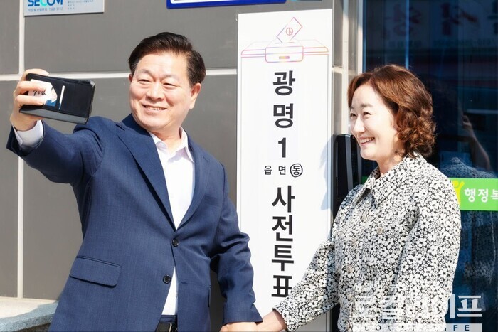 [광명=로컬라이프] 송준형 기자 = 박승원 광명시장이 부인과 함께 사전투표를 했다.