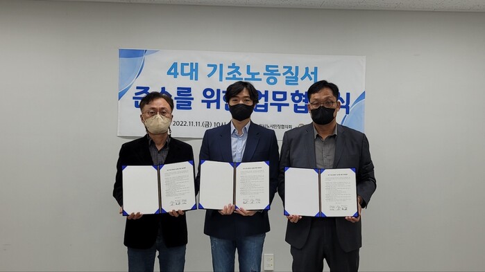 수원특례시(노사민정협의회)와 뜰카페, 수원시비정규직노동자복지센터는 11일 수원시노동자종합복지관 회의실에서 ‘4대 기초노동질서 준수 업무협약’을 체결하고, 노동인권 보호를 위해 적극적으로 협력하기로 했다.