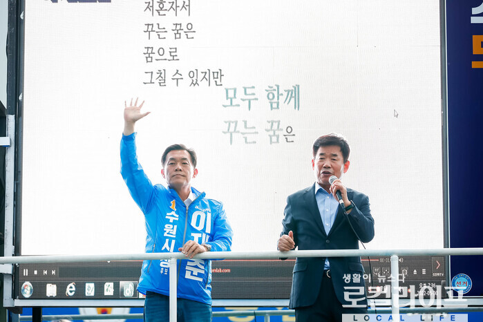 | ▲ 지난 지방선거 당시 김진표 의원(오른쪽)이 이재준 후보(왼쪽)를 지원 유세하는 모습. (사진출처=이재준 페이스북) |