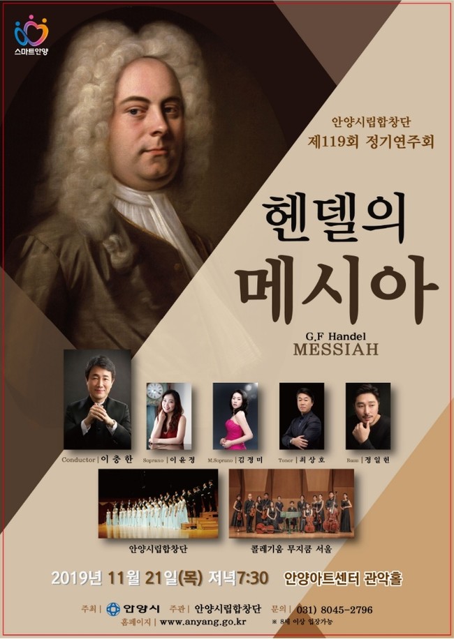안양시립합창단은 이번 공연에서 세계 3대 오라토리오로 손꼽히는 헨델의 메시아를 오케스트라 콜레기움 무지쿰 서울, 소프라노 이윤정, 메조소프라노 김정미, 테너 최상호, 베이스 정일헌 성악가와의 협연을 펼칠 예정이다.