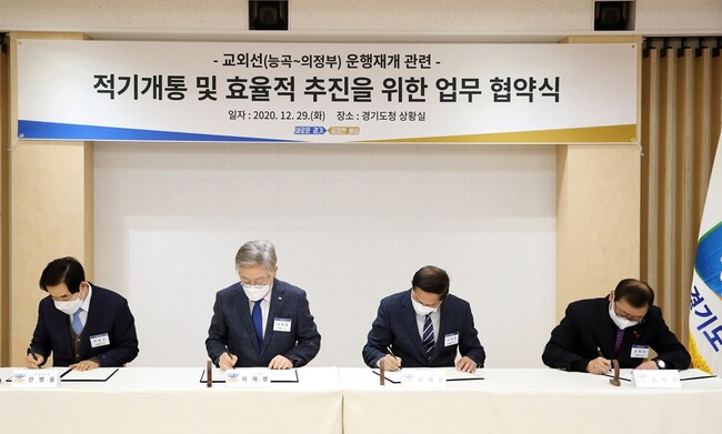 [로컬라이프] 의정부시(시장 안병용)는 12월 29일 경기도청 상황실에서 이재명 경기도지사와 안병용 의정부시장, 이재준 고양시장, 조학수 양주부시장이 참석한 가운데 교외선 운행 재개 적기개통 및 효율적 추진을 위한 업무협약을 체결했다고 밝혔다.