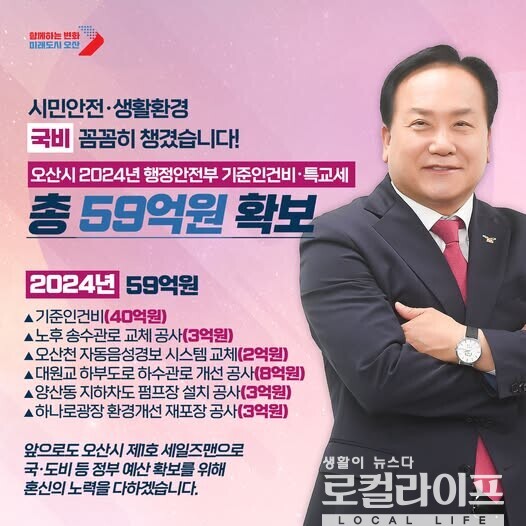 [오산=로컬라이프] 송준형 기자 = 이권재 오산시장이 기준인건비 및 국비 예산 확보 소식을 전하며 “시민안전·생활환경 개선 국비 꼼꼼히 챙겼다”고 강조했다.