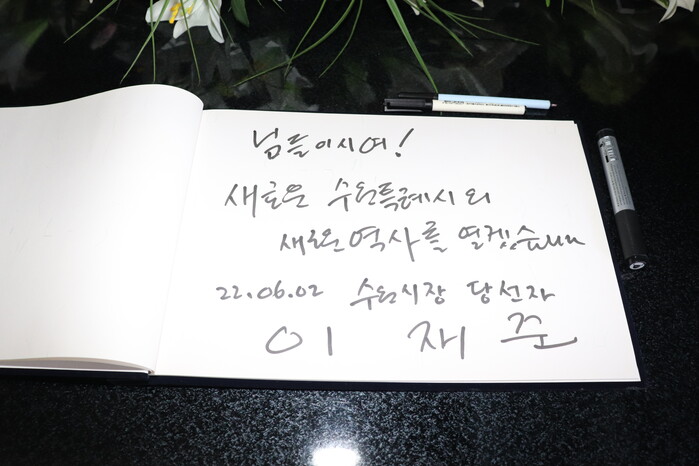 이 당선인은 방명록에 “님들이시여! 새로운 수원특례시의 새로운 역사를 열겠습니다”라고 적었다.