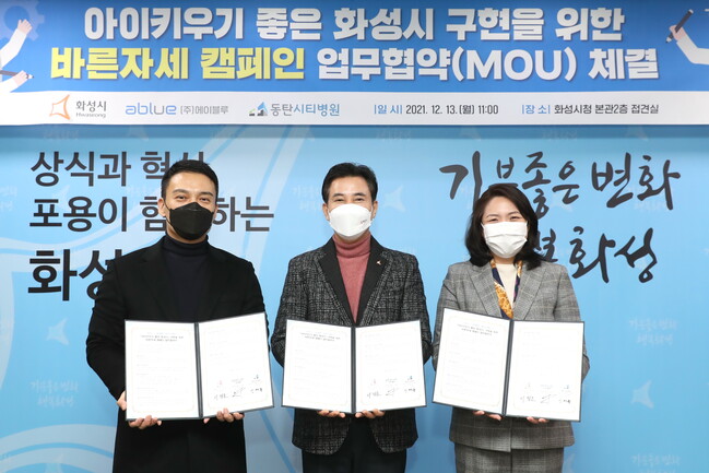 화성시는 13일 ㈜에이블루, 동탄시티병원과 함께 ‘아이키우기 좋은 화성시’ 구현을 위한 ‘바른자세 캠페인’ 업무협약을 체결했다.