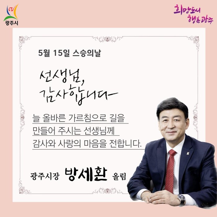 [로컬라이프] 송준형 기자 = 방세환 광주시장은 선생님들이 올바르게 가르치고 미소 지을 때마다 우리의 미래가 밝아진다고 강조했다.