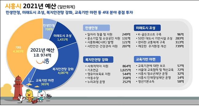 더욱더 견고한 복지안전망 강화를 위해 △장애인보호작업장 지원 36억 원 △외국인 아동 보육료 21억 원 △시흥형 주거복지 지원 14억 원 등 사회적약자 864억 원, 노인 1,229억 원, 아동 및 여성지원에 1,994억 원 등 총4,087억 원을 편성했다.