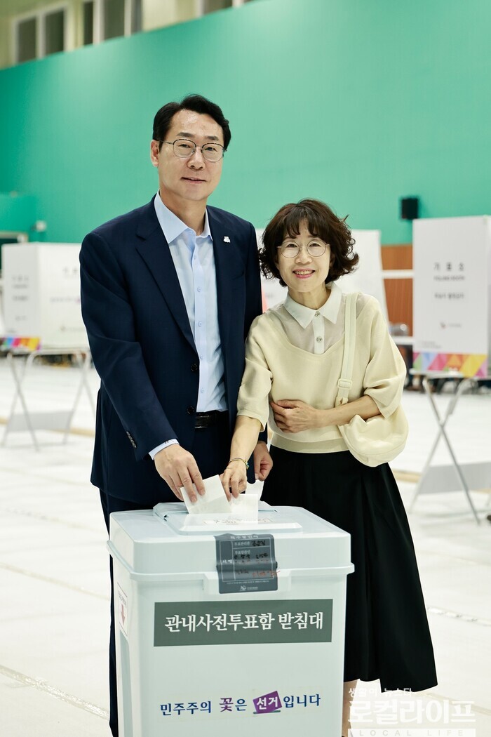[화성=로컬라이프] 송준형 기자 = 정명근 화성특례시장이 부인과 함께 사전투표를 했다.